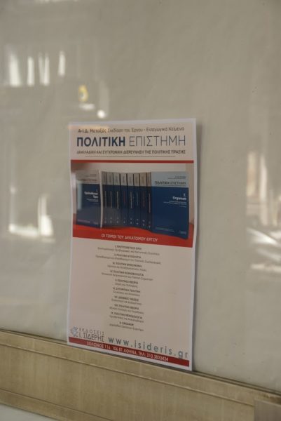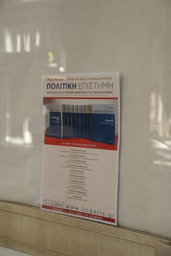 Στην Παρόδιο Στοά του πανεπιστημιακού κτηρίου επί των οδών Αιόλου-Κολοκοτρώνη-Βασιλικής, αμέσως μετά τη λήξη της έκθεσης των έργων της Λίας Σταμοπούλου, πριν τα Χριστούγεννα, τοποθετήθηκαν 10 μεγάλα banners. Αυτά αντιστοιχούσαν στα εξώφυλλα του 10τομου συλλογικού έργου “Πολιτική Επιστήμη. Διακλαδική και Συγχρονική Διερεύνηση της Πολιτικής Πράξης”. Είναι σχεδιασμένο από τον Καθηγητή Γιάννη Μεταξά, Μέλος της Academie Europeenne Interdisciplinaire des Sciences – και το οποίο στεγάζεται στις σειρές του Ιδρύματος Θεμιστοκλή και Δημήτρη Τσάτσου – και κυκλοφόρησε από τις Εκδόσεις Ι. ΣΙΔΕΡΗΣ.
