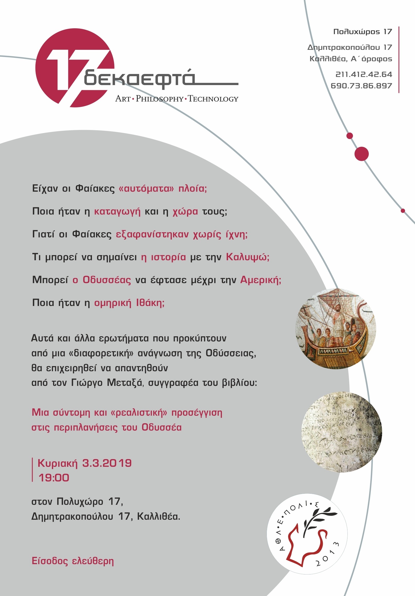 “Μια σύντομη και «ρεαλιστική» προσέγγιση στις περιπλανήσεις του Οδυσσέα”  των εκδόσεων μας την Κυριακή 3.3.2019  και ώρα 19:00