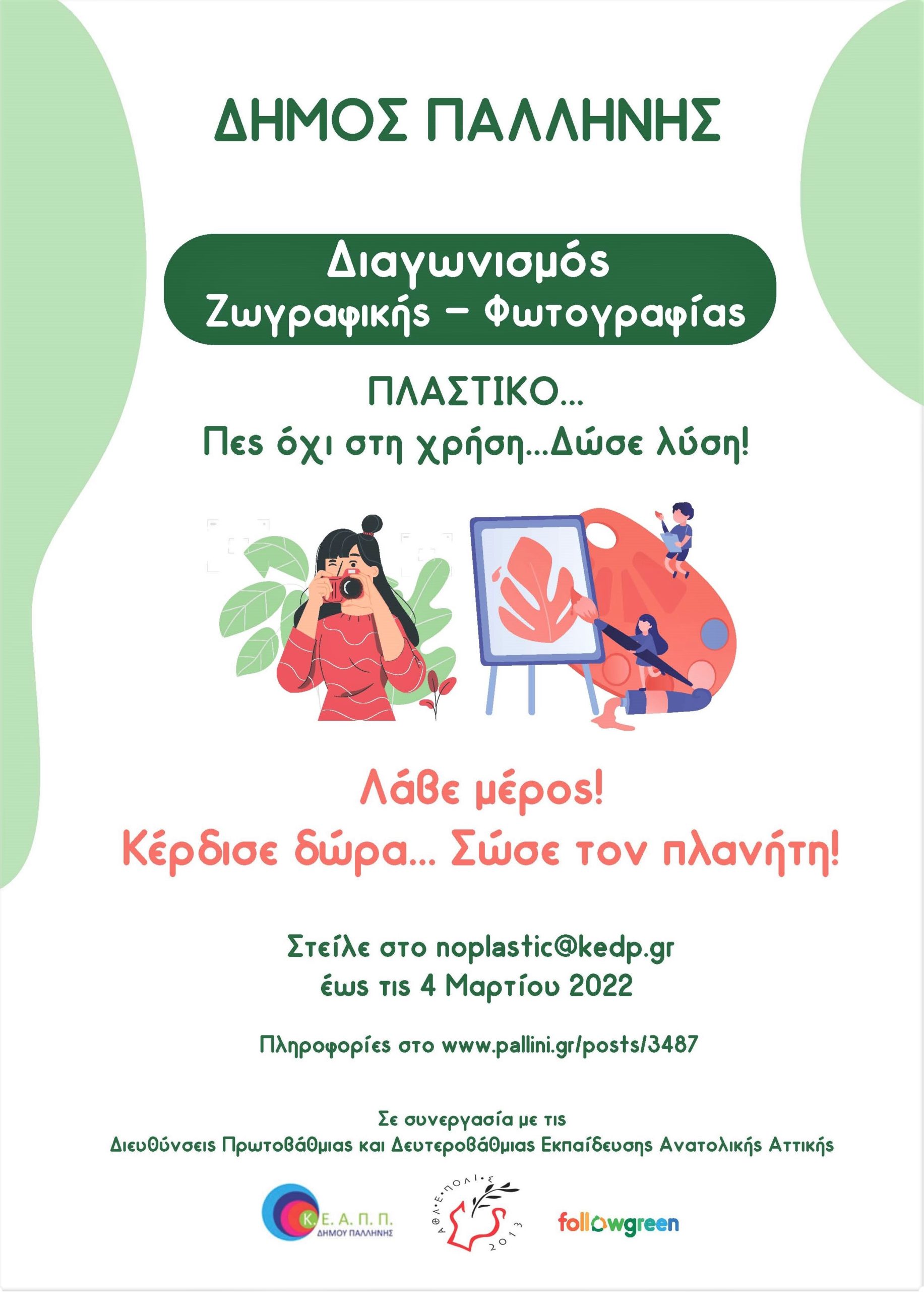 Ο Δήμος Παλλήνης σε συνεργασία, τον φωτογραφικό όμιλο ΠΡΙΣΜΑ του Αθλητικού Επιστημονικού Πολιτιστικού Σωματείου ΑΘΛ.Ε.ΠΟΛΙ.Σ, διοργανώνουν δράση φωτογραφίας με τίτλο «Πλαστικό… Πες όχι στη χρήση…. Δώσε λύση», ο οποίος θα υλοποιηθεί από την Κοινωφελή Επιχείρηση Αθλητισμού-Πολιτισμού και Περιβάλλοντος (Κ.Ε.Α.Π.Π. ) του Δήμου Παλλήνης.