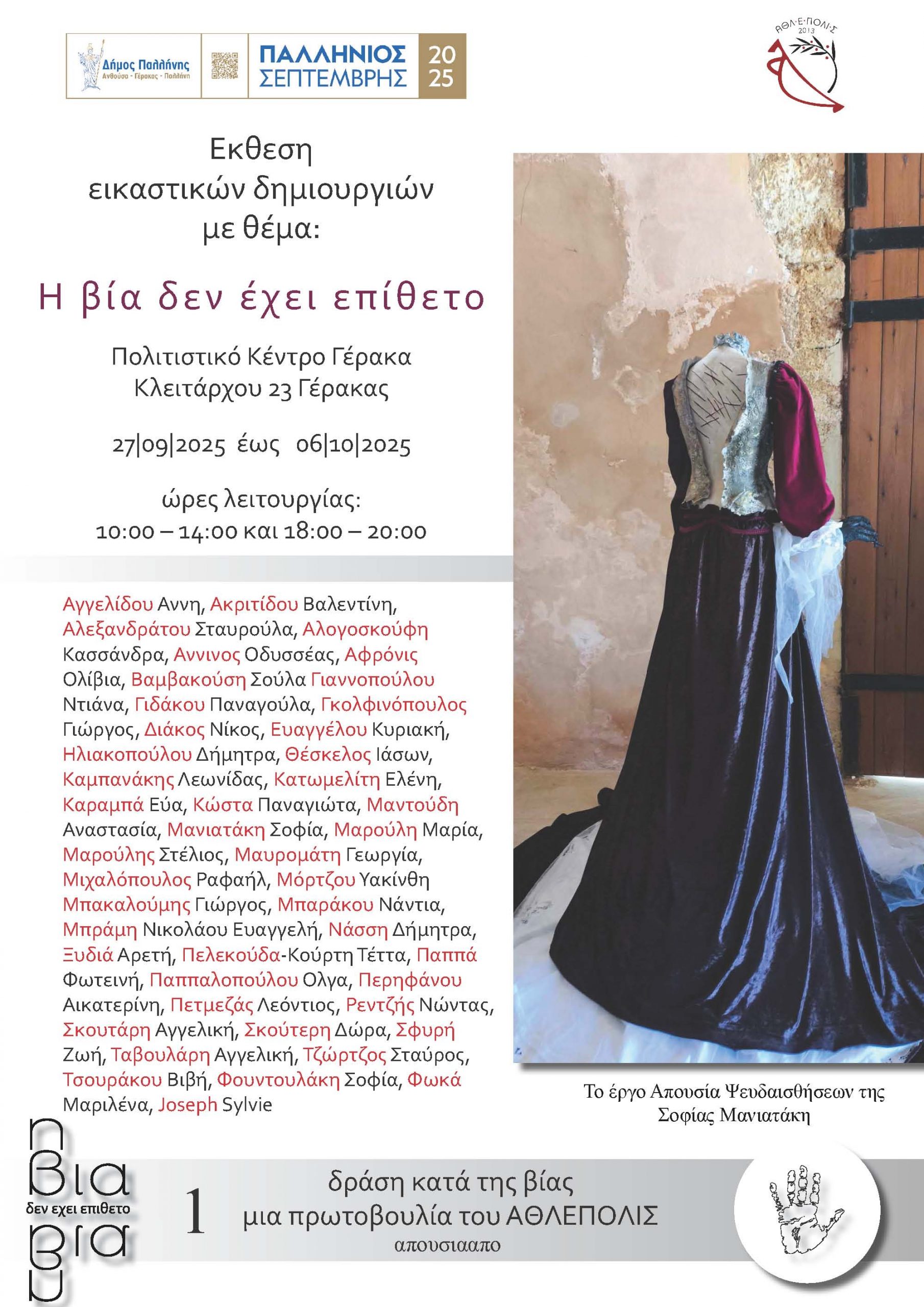 Το Σάββατο 27 Σεπτεμβρίου 2025, το Αθλητικό Επιστημονικό Σωματείο ΑΘΛΕΠΟΛΙΣ , η Ένωση Καλλιτεχνών και Λογοτεχνών Ηλιούπολης, και 45 εικαστικοί καλλιτέχνες στο πλαίσιο των πολιτιστικών εκδηλώσεων «Παλλήνιος Σεπτέμβρης 2025» με στεντόρια, γεμάτη χρώματα φωνή μας καλούν να μην δεχτούμε κανένα επίθετο που να προσδιορίζει τη βία… πόσο μάλλον την ίδια τη βία.