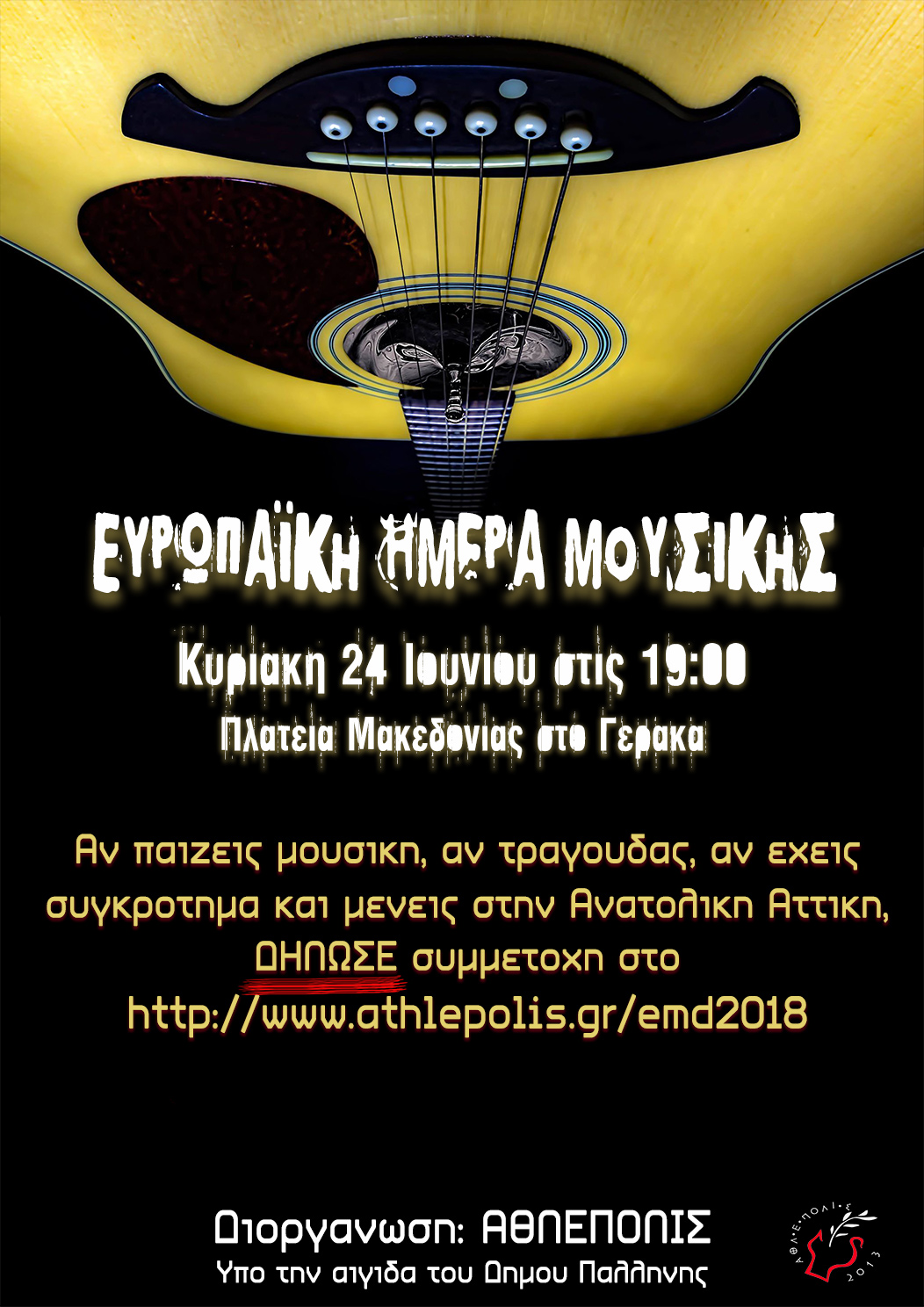 Το Αθλητικό Επιστημονικό Πολιτιστικό Σωματείο (ΑΘΛΕΠΟΛΙΣ) συμμετέχει σε αυτή διοργανώνοντας, υπό την αιγίδα του Δήμου Παλλήνης, Γιορτή Μουσικής στην πλατεία Μακεδονίας στον Γέρακα, στις 24 Ιουνίου 2018 και ώρα από 19:00 μέχρι 24:00.