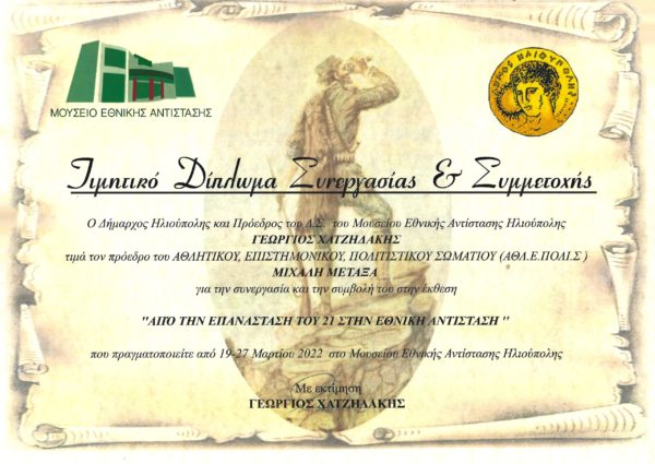 Ο Δήμαρχος Ηλιούπολης Γεώργιος Χατζηδάκης τιμώντας το Σωματείο μας απένειμε τιμητικό δίπλωμα Συνεργασίας και Συμμετοχής.