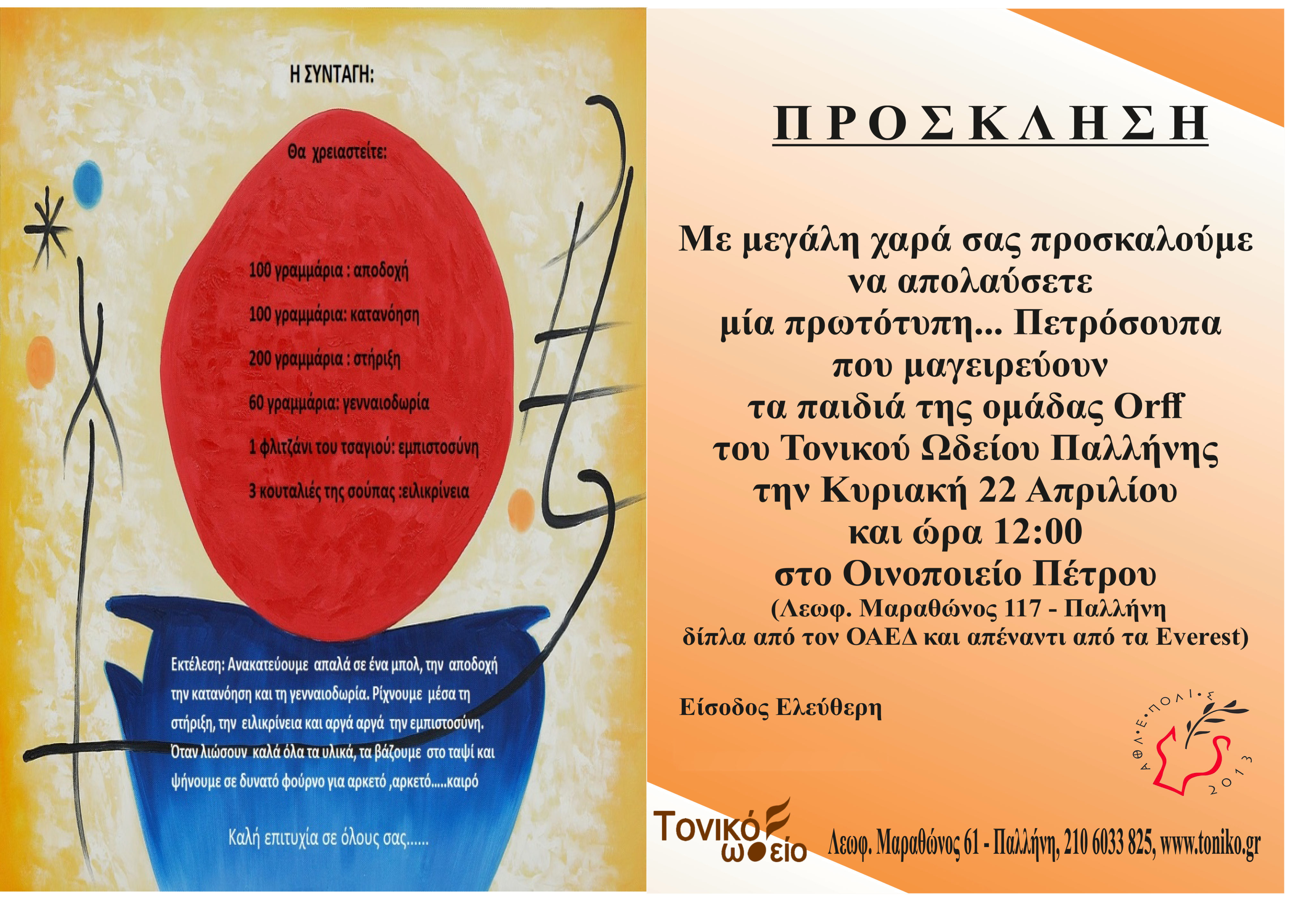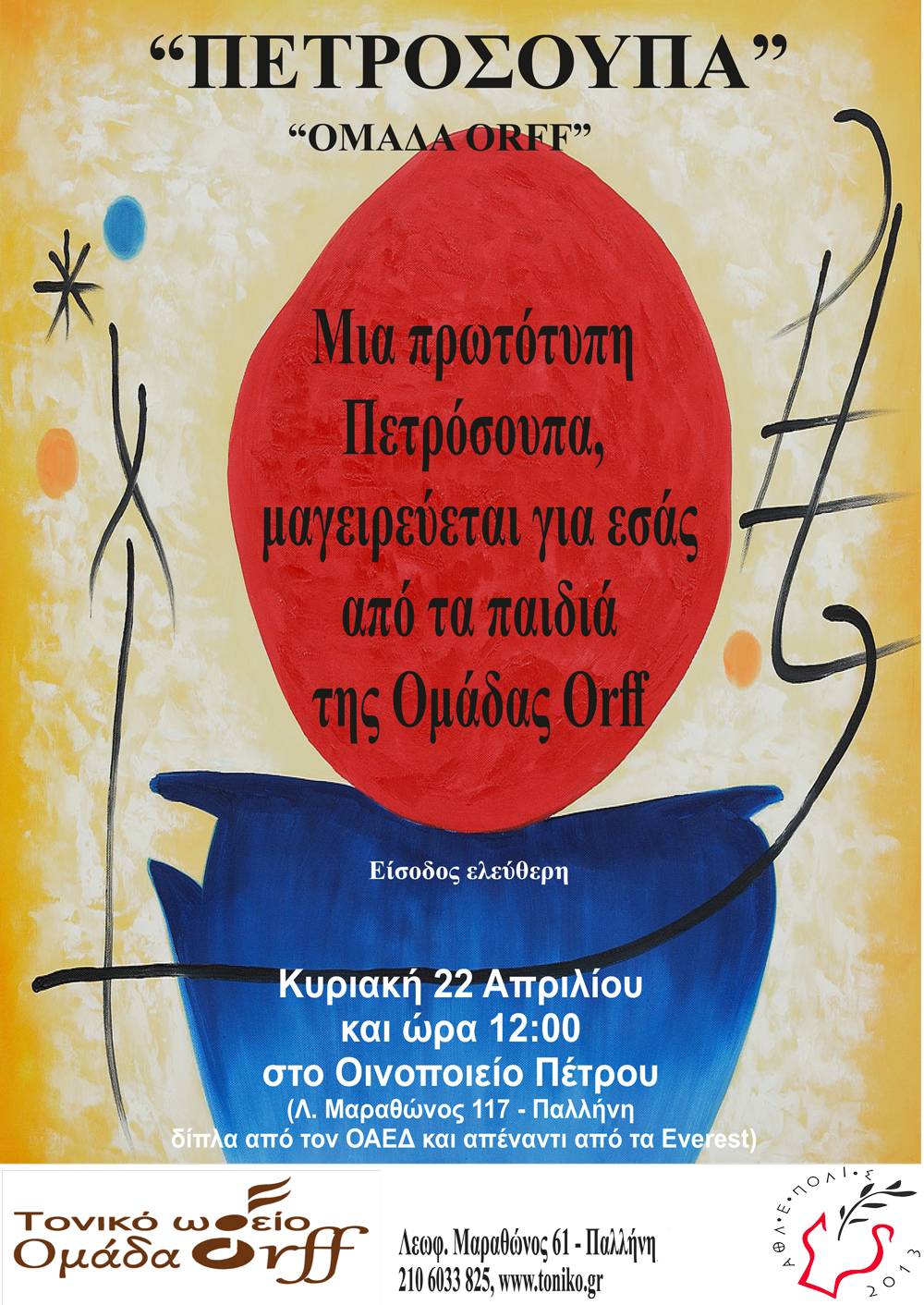 Μουσικοθεατρική παράσταση “ΠΕΤΡΟΣΟΥΠΑ” 18 April 2018 Δράσεις, Νέα-Πολιτισμός, Τα Νέα μας Στο Οινοποιείο Πέτρου την Κυριακή, 22 Απριλίου 2018 και ώρα 12, θα πραγματοποιηθεί η μουσικοθεατρική παράσταση «ΠΕΤΡΟΣΟΥΠΑ» για τα παιδιά του Δήμου Παλλήνης, από την ομάδα Οrff του Τονικού Ωδείου Παλλήνης και το ΑΘΛ.Ε.ΠΟΛΙ.Σ.. Η είσοδος είναι ελεύθερη. Share This Twitter Facebook LinkedIn Email michalis Related Posts Δελτιο Τύπου Εγκαίνια έκθεσης εικαστικών δημιουργιών με θέμα: Η ΒΙΑ ΔΕΝ ΕΧΕΙ ΕΠΙΘΕΤΟ Το Σάββατο 27 Σεπτεμβρίου 2025, το Αθλητικό Επιστημονικό Σωματείο ΑΘΛΕΠΟΛΙΣ , η Ένωση Καλλιτεχνών και… Εγκαίνια της έκθεσης εικαστικών δημιουργιών με θέμα: Η β ί α δ ε ν έ χ ε ι ε π ί θ ε τ ο Το Αθλητικό Επιστημονικό Πολιτιστικό Σωματείο ΑΘΛΕΠΟΛΙΣ και η Ένωση Καλλιτεχνών & Λογοτεχνών Ηλιούπολης υπό την… Δελτίο Τύπου: Διπλό Μουσικό Αφιέρωμα από τη Μαντολινάτα και Εστουδιαντίνα Αλεξάνδρου Το Σάββατο 10 Μαΐου 2025, το Τονικό Ωδείο Παλλήνης και το Αθλητικό Επιστημονικό Σωματείο ΑΘΛΕΠΟΛΙΣ… This Post Has 0 Comments Leave a Reply Cancel replyYour email address will not be published. Required fields are marked *Name * Email * Website Comment * Δ This site uses Akismet to reduce spam. Learn how your comment data is processed.